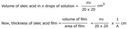 Let us now discuss a technique for determining approximately the molecular size of oleic acid. Oleic acid is a soapy liquid having a sufficiently large molecular size of the order of 10-9 m. Let us dissolve 1 cm3 of oleic acid in 20 cm3 of alcohol. Again, dissolve 1 cm3 of this solution in 20 cm3 of alcohol so that the concentration of 1 oleic acid in alcohol is 1/(20 × 20) cm3 . A few drops of the solution so prepared are put on to the surface of water. The film so formed is stretched so that its thickness is just equal to molecular size. When the alcohol evaporates, a film of oleic acid is left. The area 'A' of the film is measured by using a tracing paper and a graph sheet.