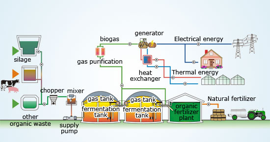 In the fermenter which is heated approximately at 38-40 °C, the substrate is decomposed by the micro organisms under exclusion of light and oxygen. The final product of this fermentation process is biogas with methane as the main ingredient. But aggressive hydrogen sulphide is also contained in the biogas. Once the substrate has been fermented, it is transported to the fermentation residues end storage tank and can be retrieved from there for further utilisation. The residues can be utilised as high quality fertiliser.