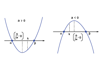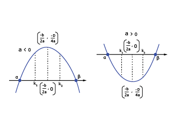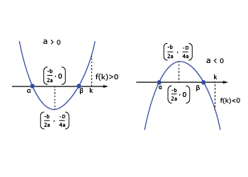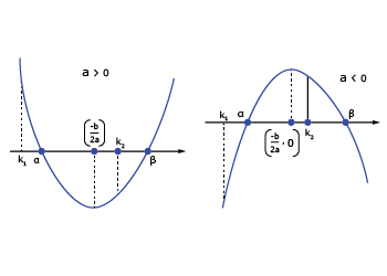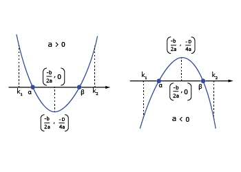 Let f(x) = ax2 bx + c, a ≠ 0 and a, b, c ∈ R, and α, β are roots of f(x) = 0. Suppose k, k1, k2 ∈ R and k1 < k2, then remember the following.