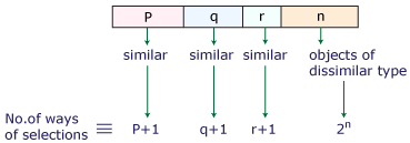 Total no. of ways where at least one object is selected = (p + 1) (q + 1) (r + 1) – 1