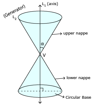 The point 'V' is called the vertex, the line L1 is the axis of cone. The rotating line L2 is called generator of a cone.